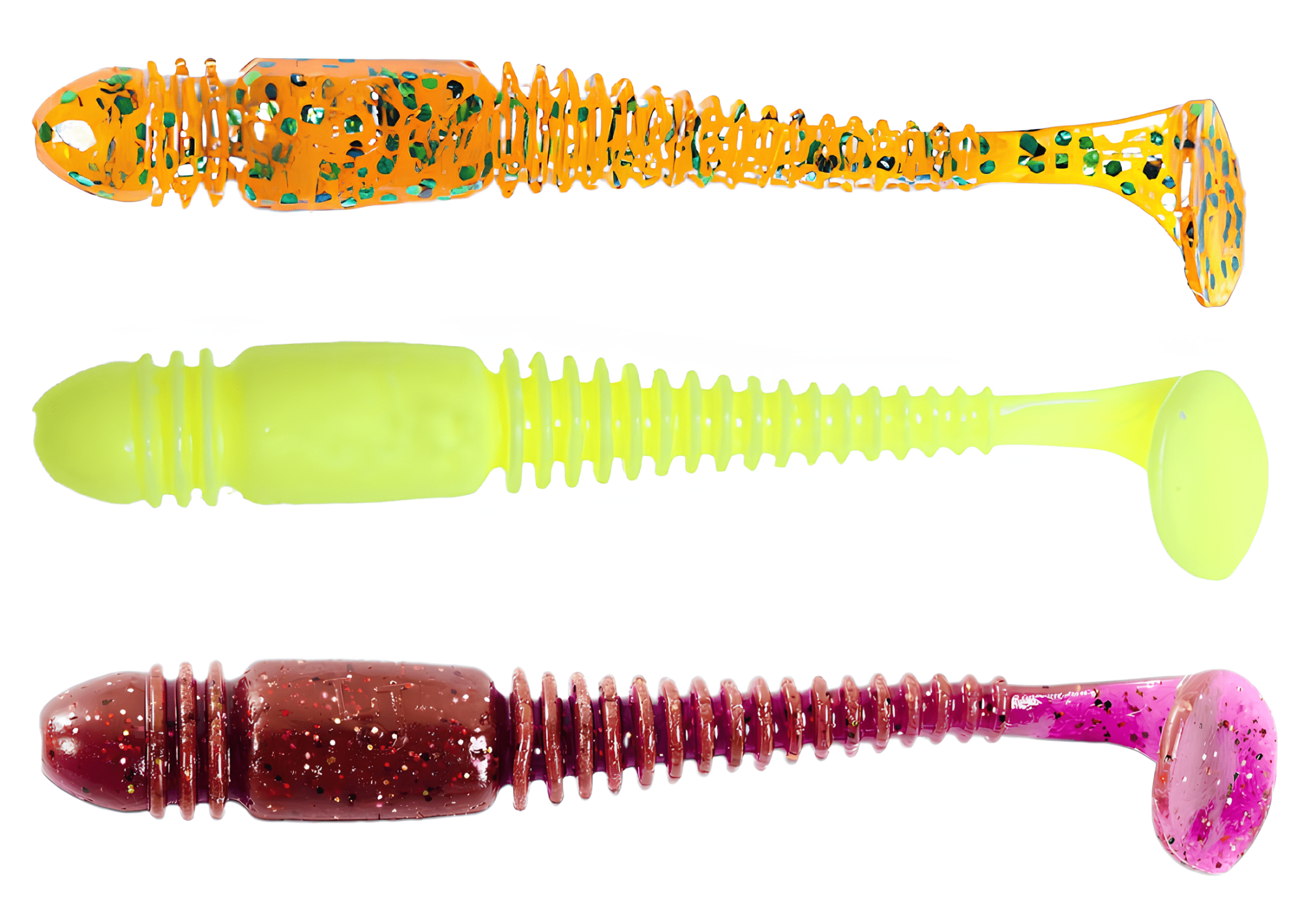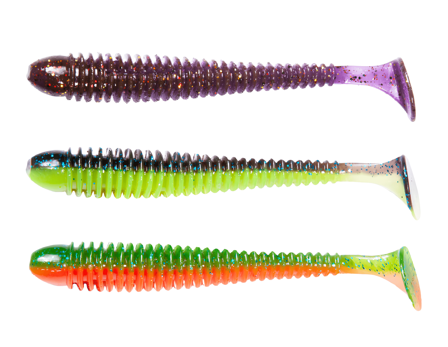Твистеры — это активные приманки, отличающиеся цилиндрической формой тела, которое может быть тонким, объемным, коротким или длинным. Поверхность твистера может быть гладкой, с легким рельефом или ярко выраженной ребристостью, что создает дополнительные акустические эффекты во время проводки, привлекая хищников. Ключевой особенностью твистера является его хвост, который, словно вопросительный знак, изгибается и создает частые колебания. Размеры, толщина и степень изогнутости хвоста у разных моделей могут различаться, что влияет на характер игры приманки. Хищные рыбы издалека замечают эти вибрации и стремительно бросаются в атаку. Твистеры часто используются в сочетании с разнесенной оснасткой, дроп-шотом и отводным поводком, что позволяет разнообразить методы ловли.